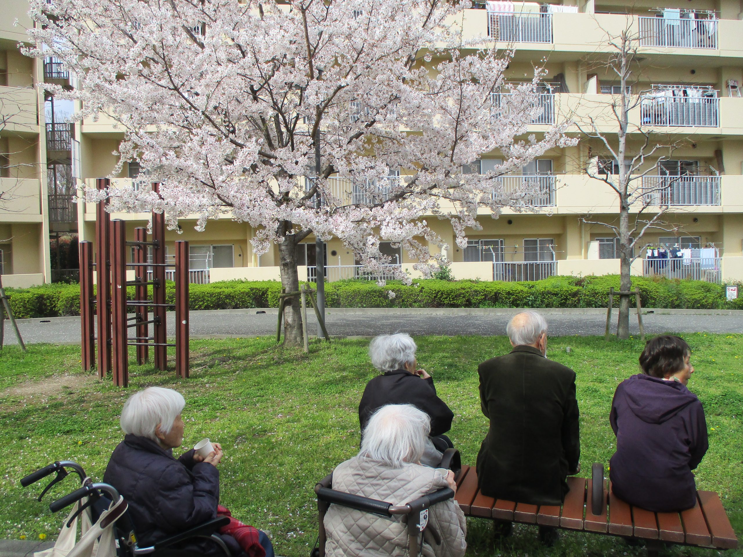 桜を見ながらおやつの桜餅を食べました。