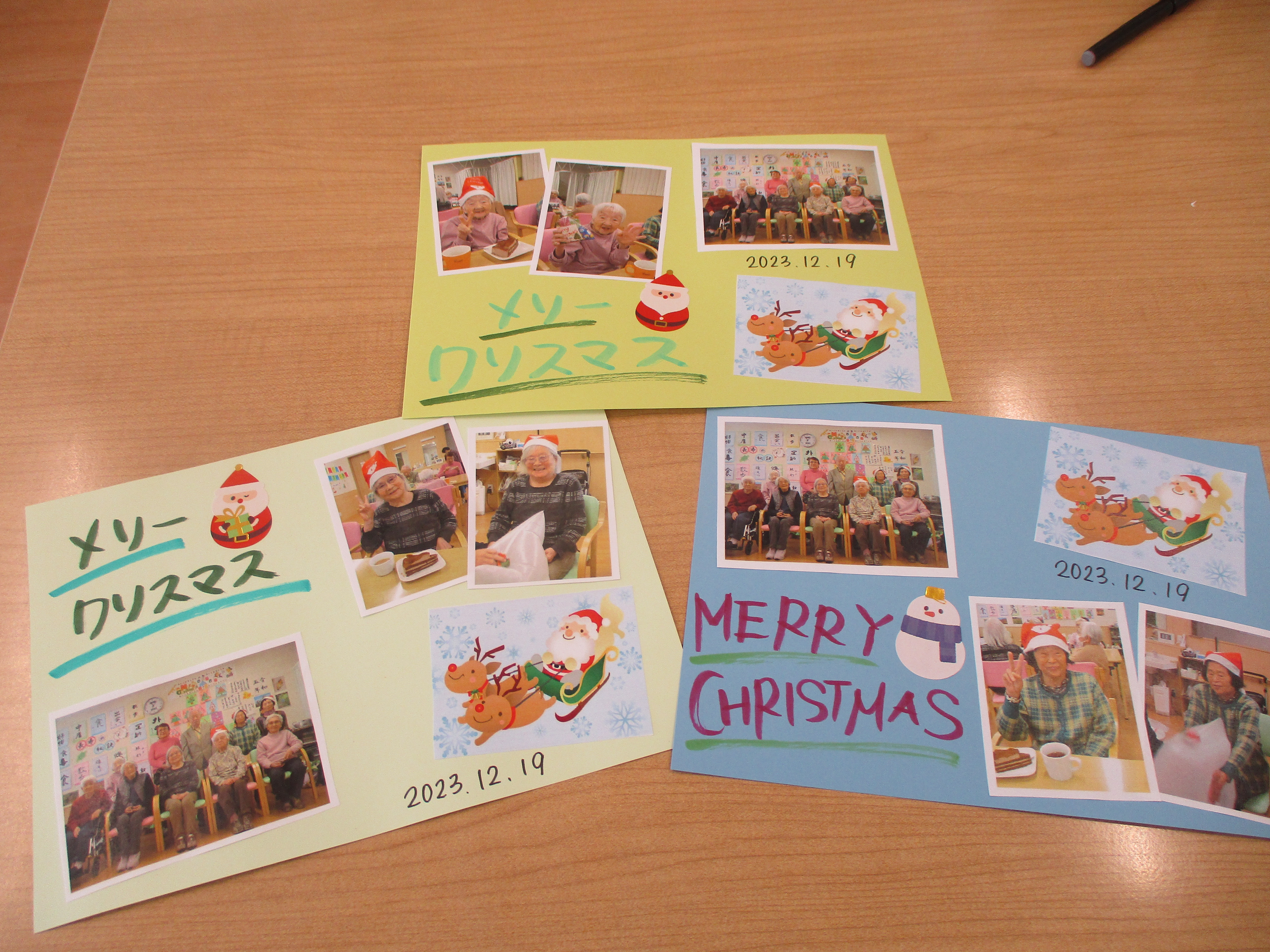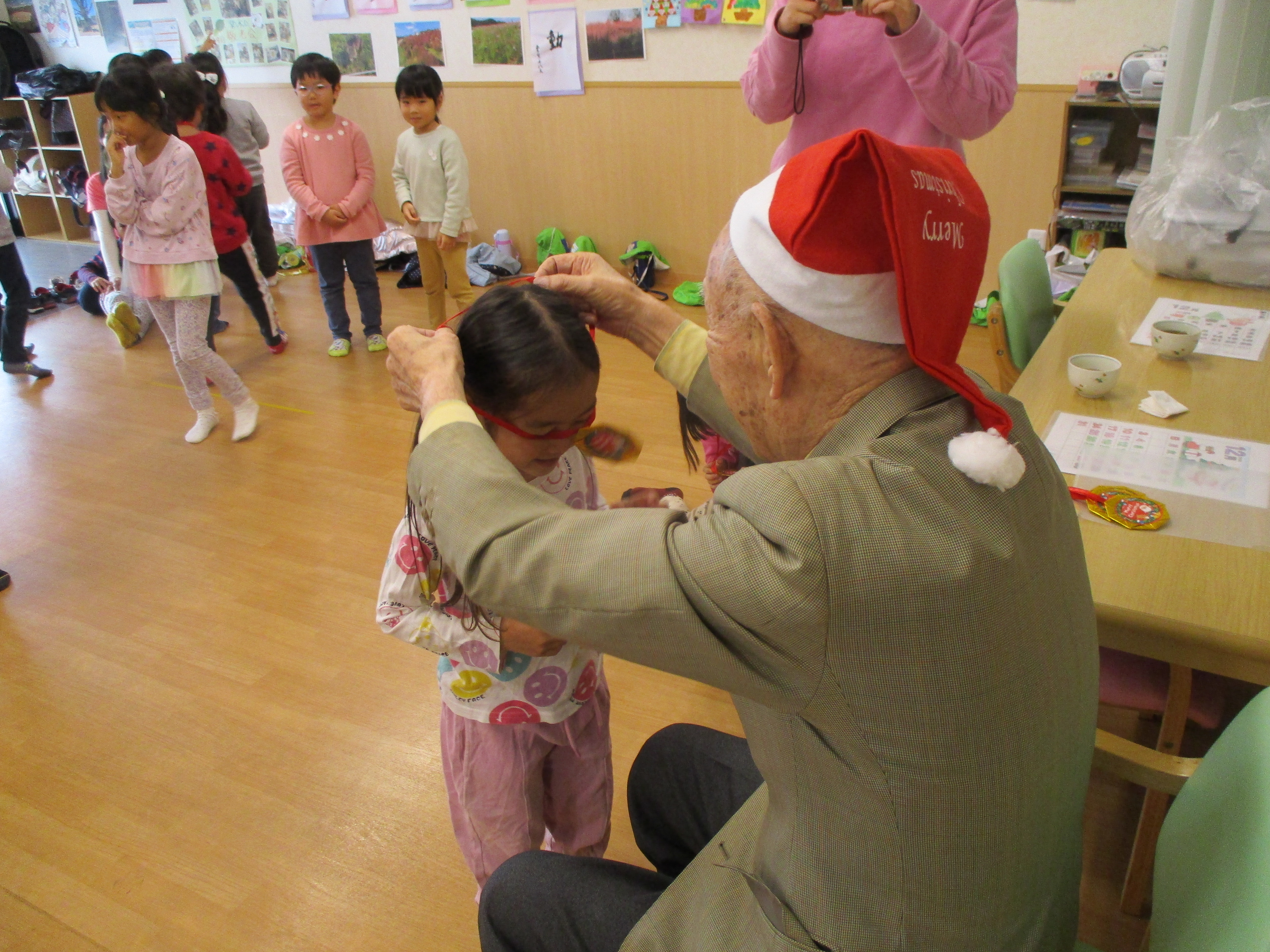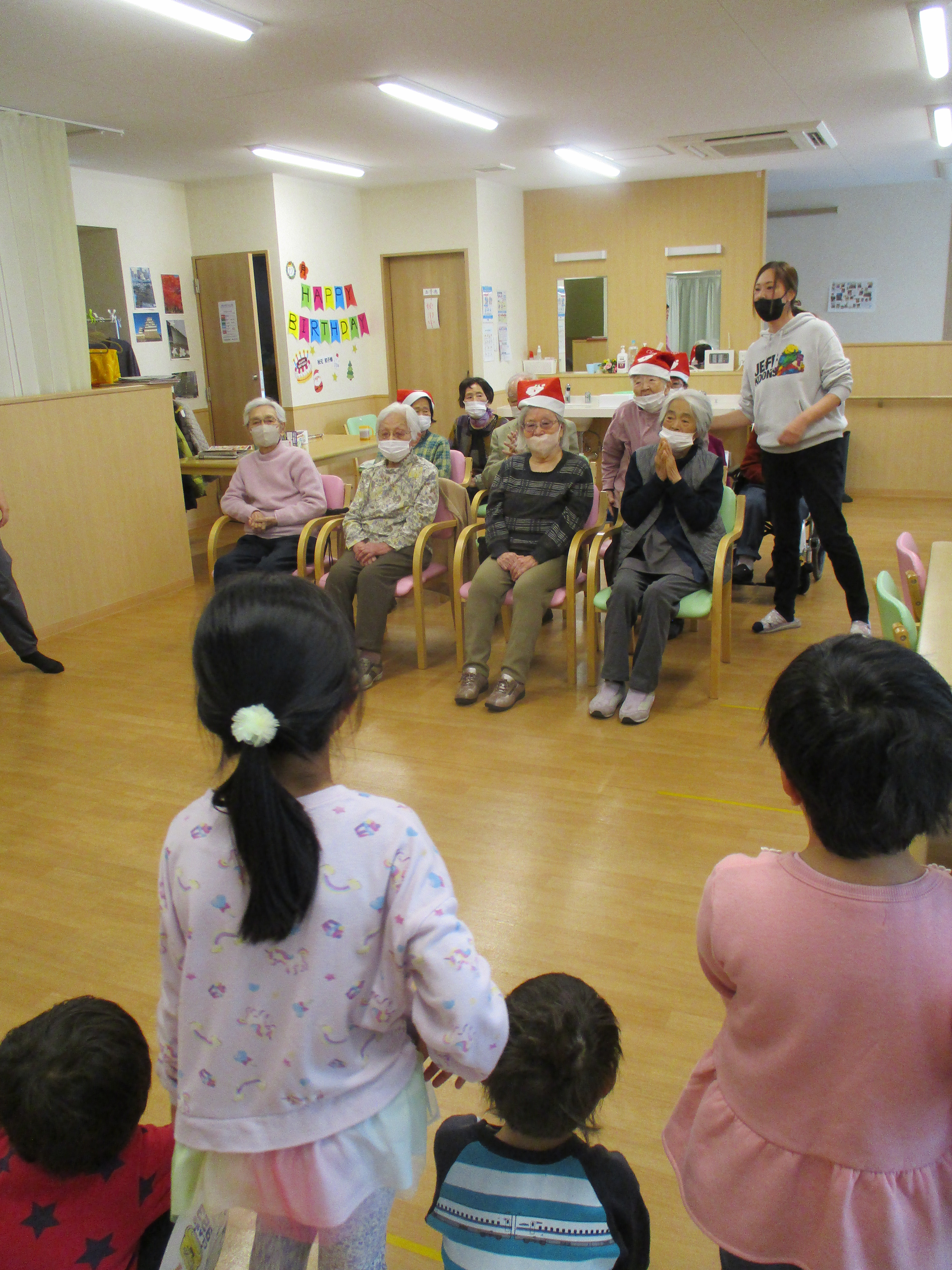 敬老会に引き続きクリスマス会にもかわいい子ども達が遊びに来てくれました。交流会まではできませんでしたがお遊戯や昔懐かしい「花いちもんめ」で遊んでる姿を見せて頂き心愛のお客様も手をたたいたり一緒に歌ったりして楽しい時間を過ごすことができました。心愛のサンタクロースから子供たちにメダルのプレゼントがありました。そのあとは、クリスマスランチを召し上がり午後からはゲーム大会で盛り上がりました。クリスマスのおやつはチョコレートケーキ。これまた、みなさん笑顔で召し上がっていました。参加されたお客様には記念品として職員手作りのクリスマスカードをお渡ししております。
