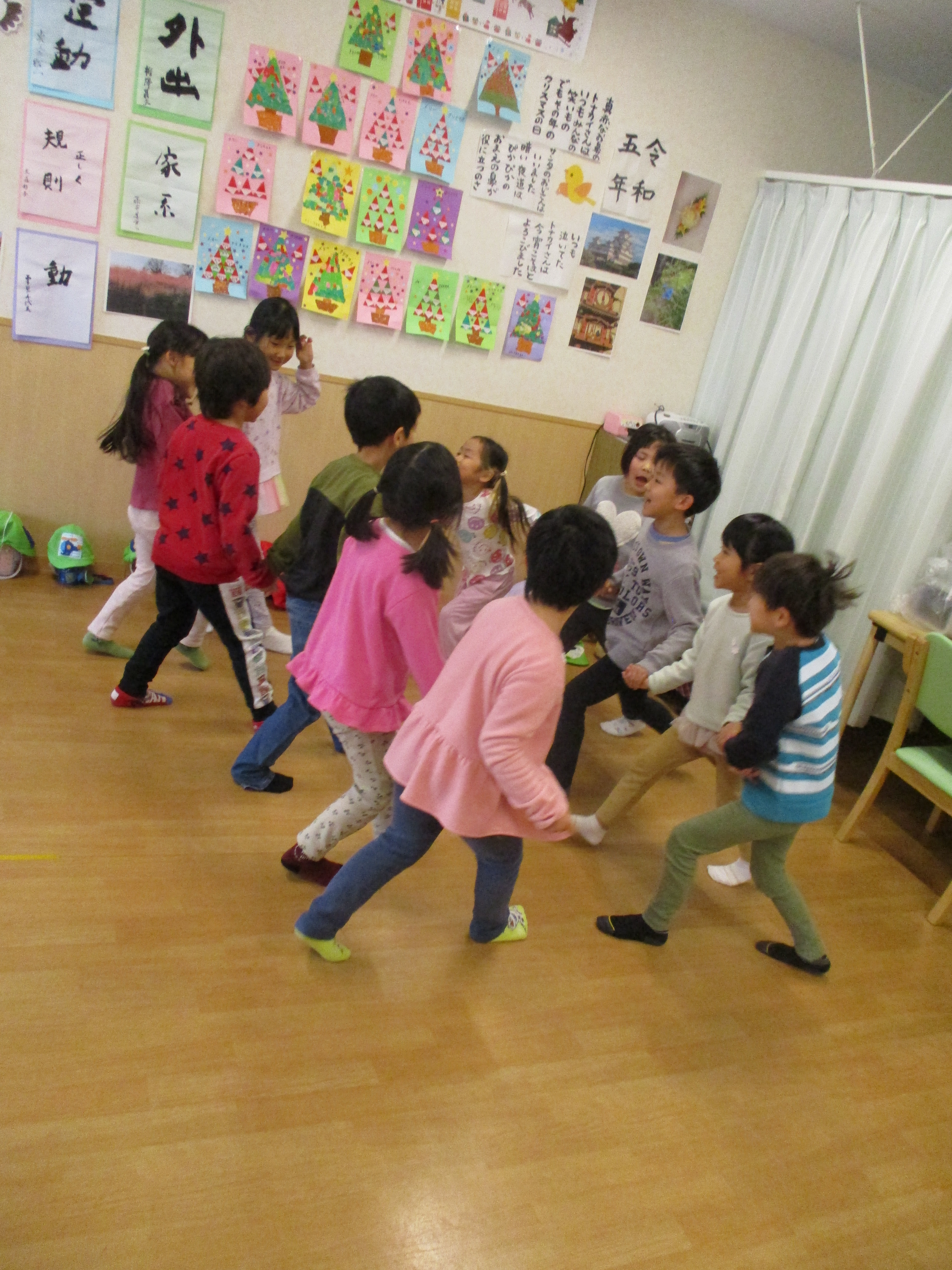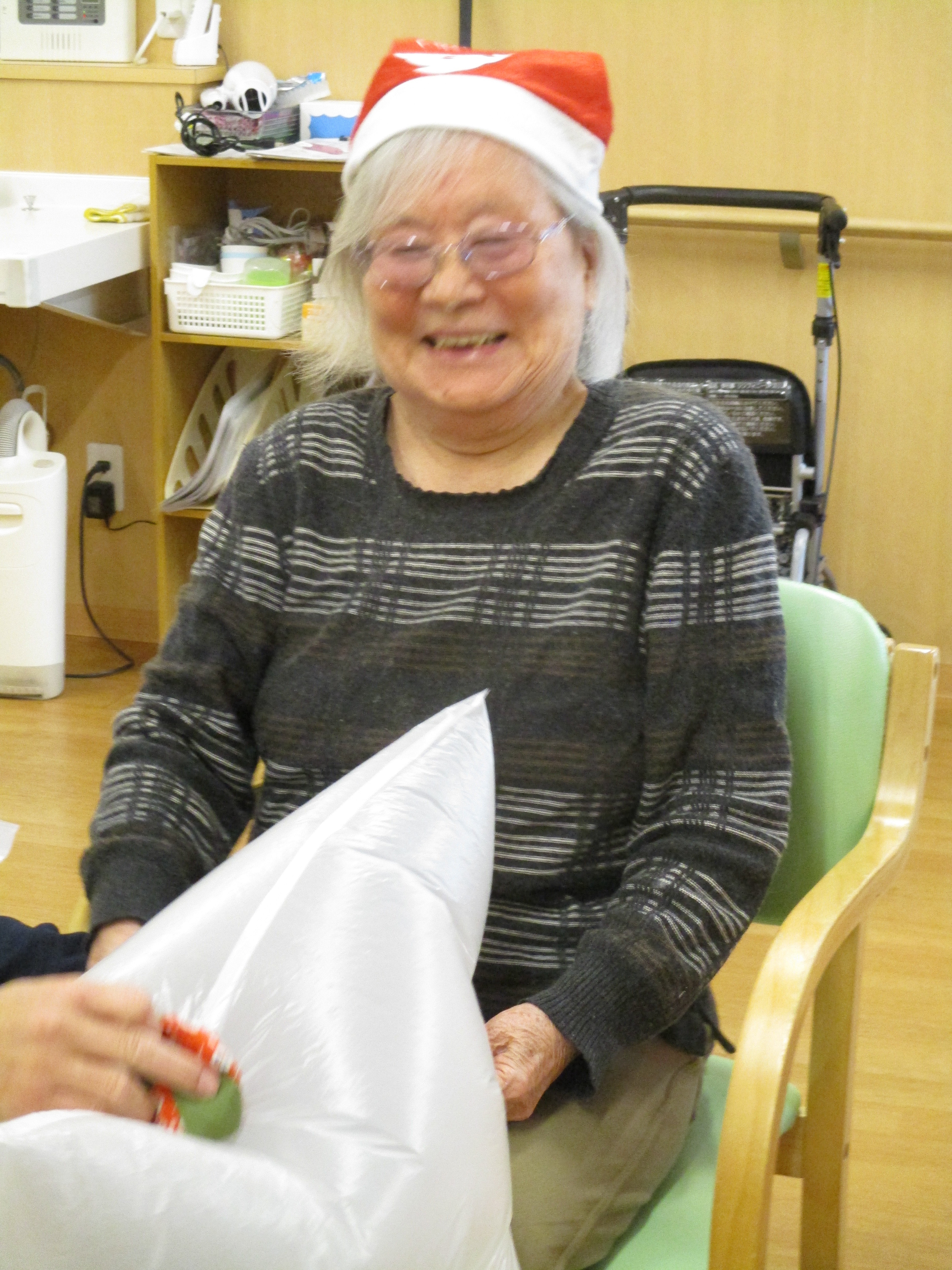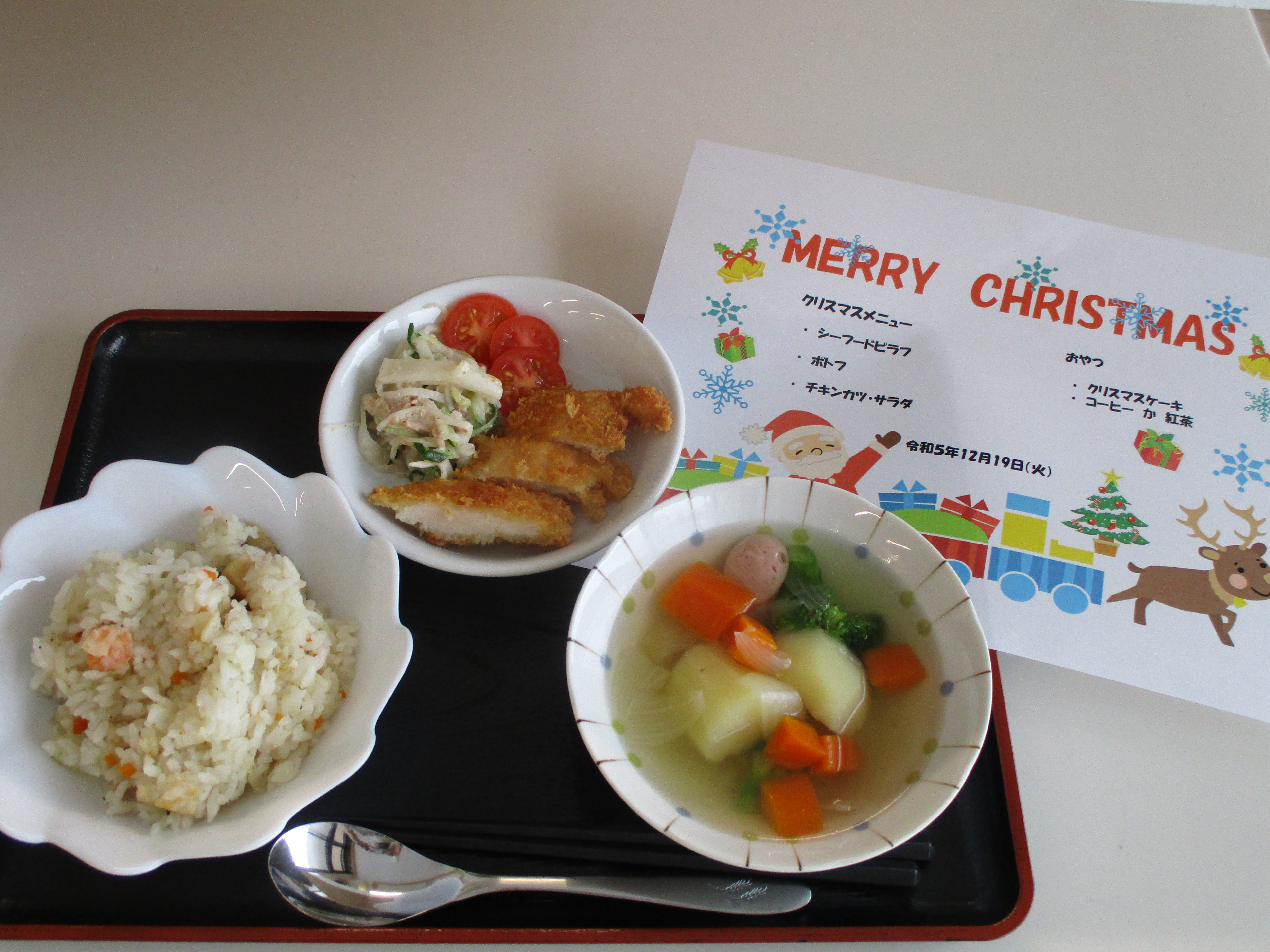 敬老会に引き続きクリスマス会にもかわいい子ども達が遊びに来てくれました。交流会まではできませんでしたがお遊戯や昔懐かしい「花いちもんめ」で遊んでる姿を見せて頂き心愛のお客様も手をたたいたり一緒に歌ったりして楽しい時間を過ごすことができました。心愛のサンタクロースから子供たちにメダルのプレゼントがありました。そのあとは、クリスマスランチを召し上がり午後からはゲーム大会で盛り上がりました。クリスマスのおやつはチョコレートケーキ。これまた、みなさん笑顔で召し上がっていました。参加されたお客様には記念品として職員手作りのクリスマスカードをお渡ししております。