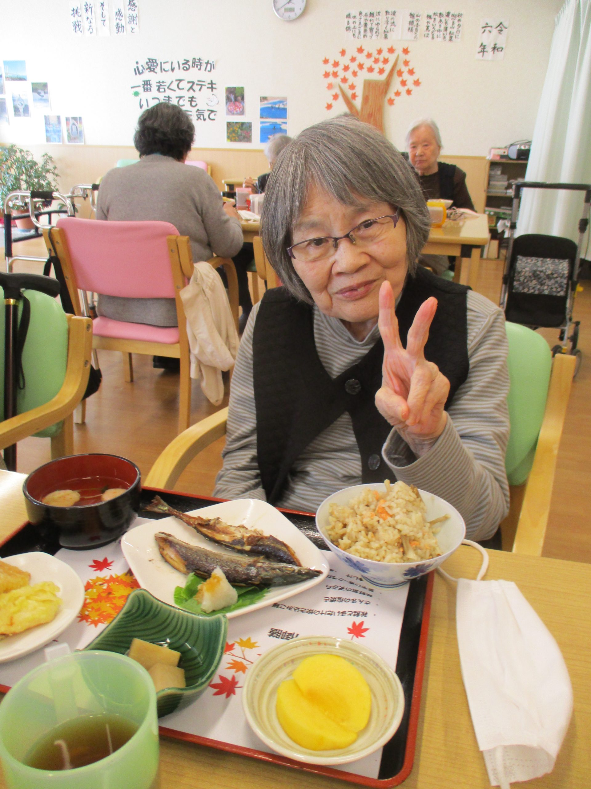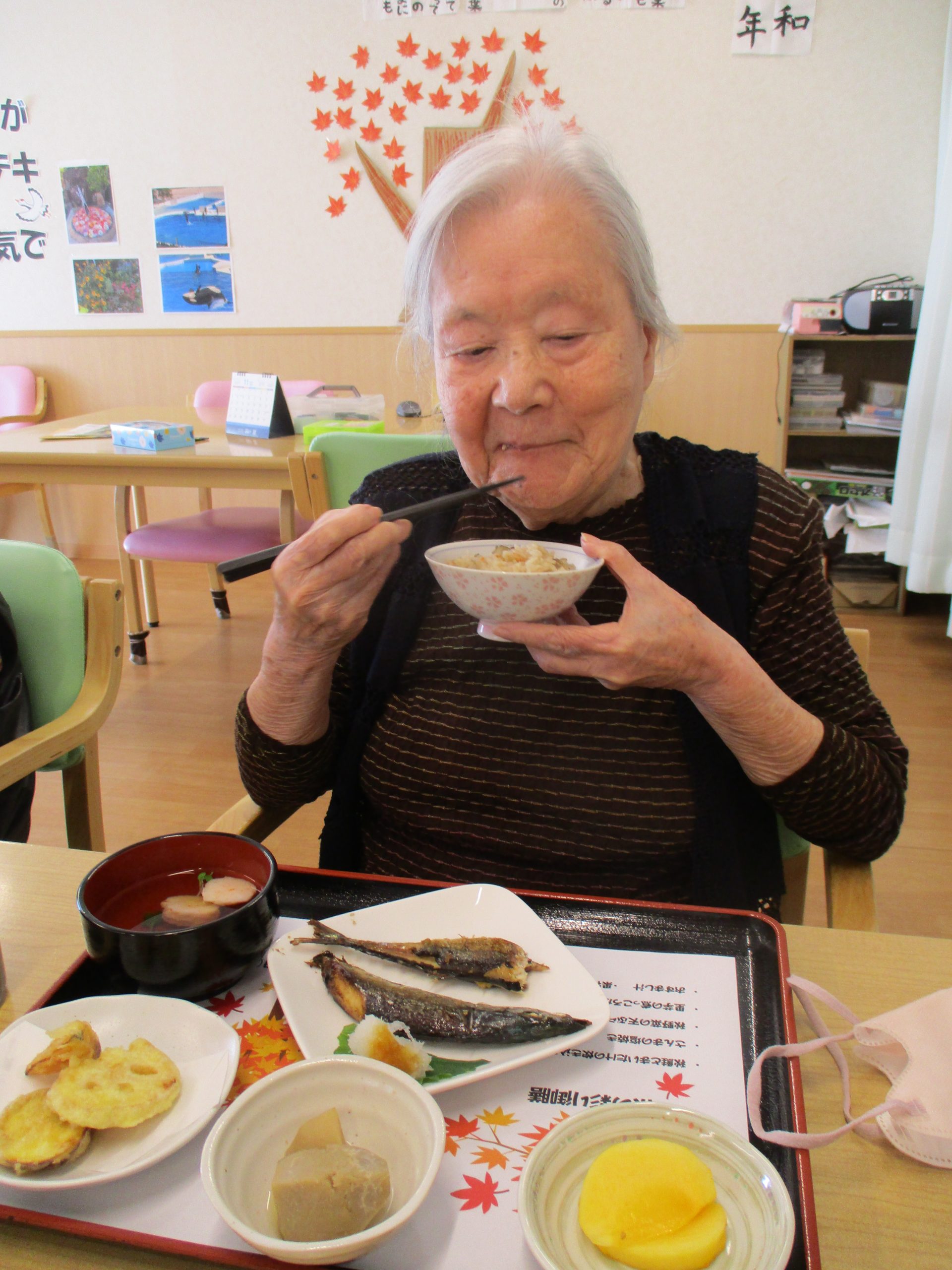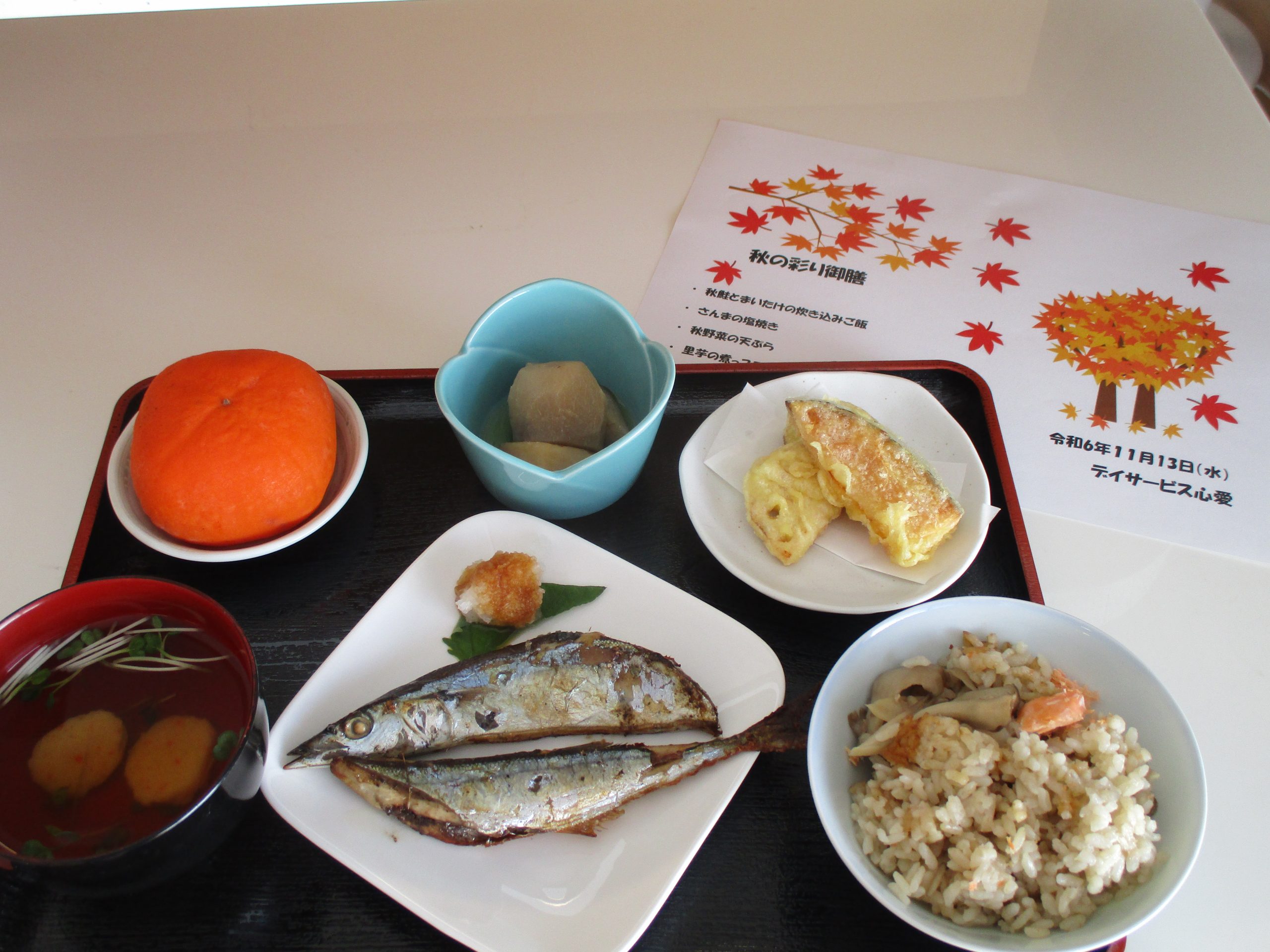 さんまの塩焼き一匹ド~ンと秋野菜の天ぷら、里芋の煮っころがし、まいたけと秋鮭の炊き込みご飯、柿の