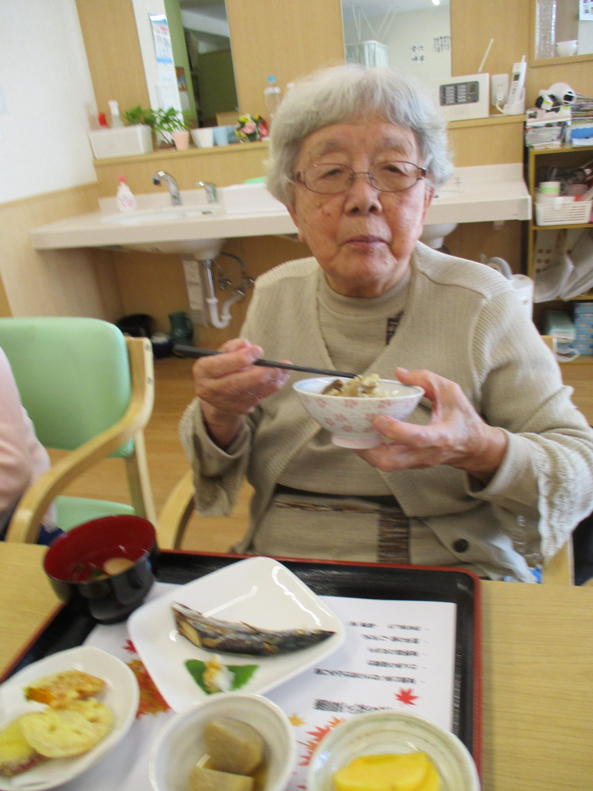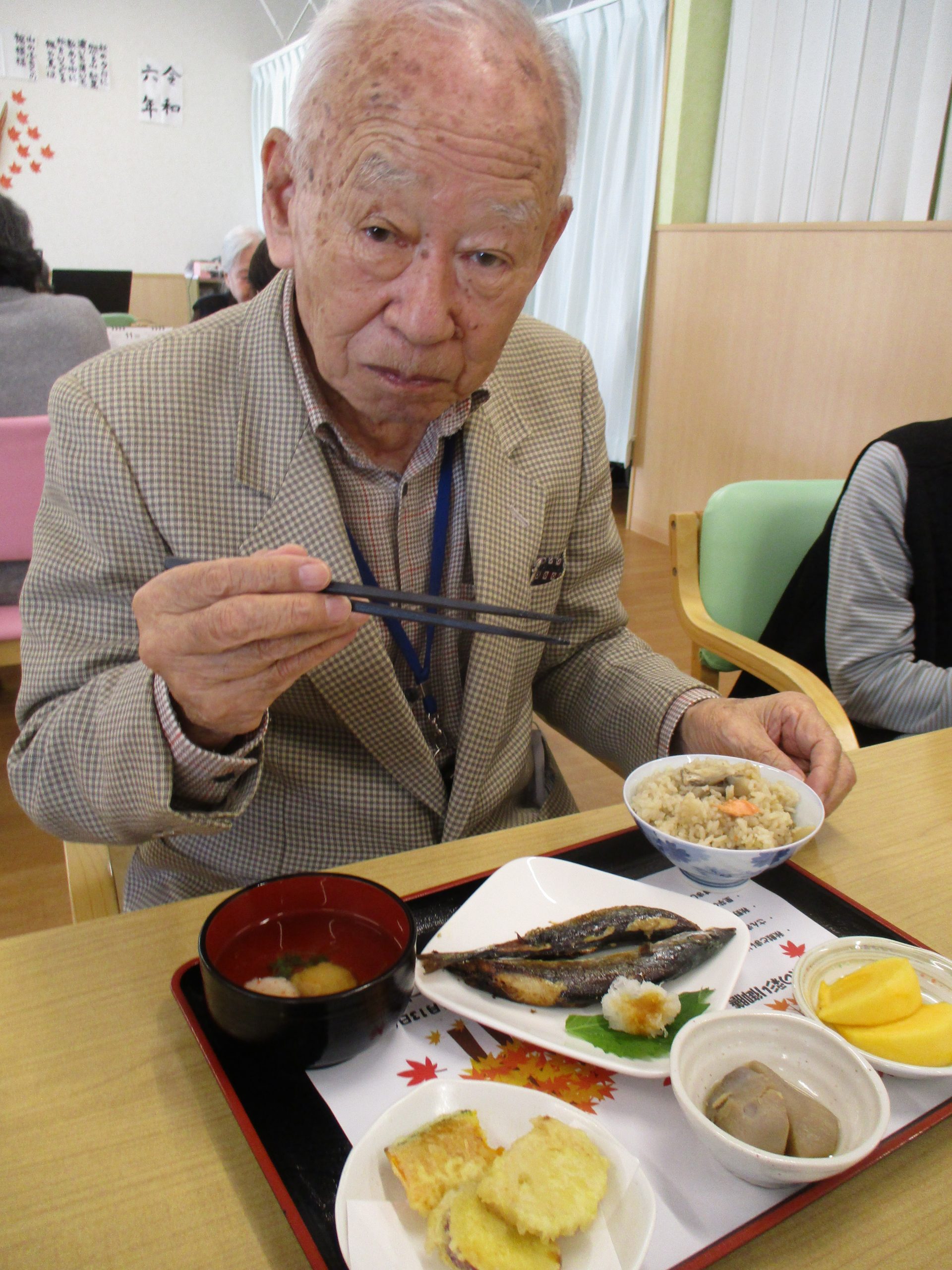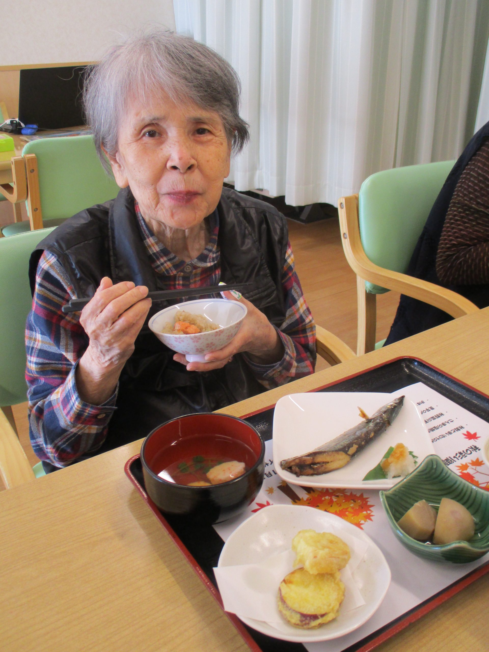 さんまの塩焼き一匹ド~ンと秋野菜の天ぷら、里芋の煮っころがし、まいたけと秋鮭の炊き込みご飯、柿の